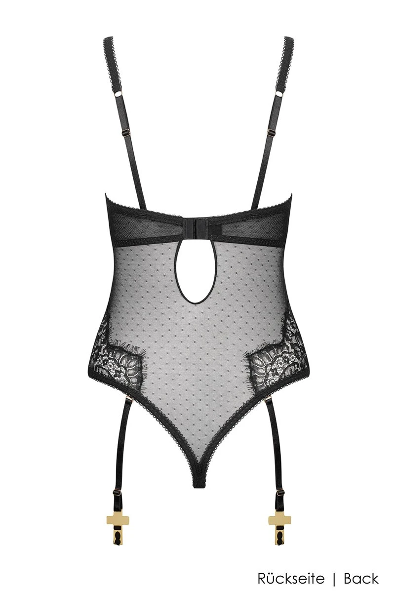 Enjoy the many pleasures the „Inspiration Divine“ Naked Breast Thong Body has to offer. You love to showcase your femininity and to engage in erotic play with your partner?!?!? Then you should have this super sexy and sophisticated Thong Body way up on your shopping list! The breathtaking design made of finest floral lace and dotted microtulle just feels amazing and offers alluring transparencies all around. The open cups with integrated wires and the opening mechanism inbetween the legs have a tentalizing effect that you and your partner will absolutely love! Additionally, 4 detachable strap holders with shiny golden crosses create a truly „divine“ look. Go all the way and combine this unique Thong Body with a pair of our finest thigh high stockings and become the Rock-Star of your love life!