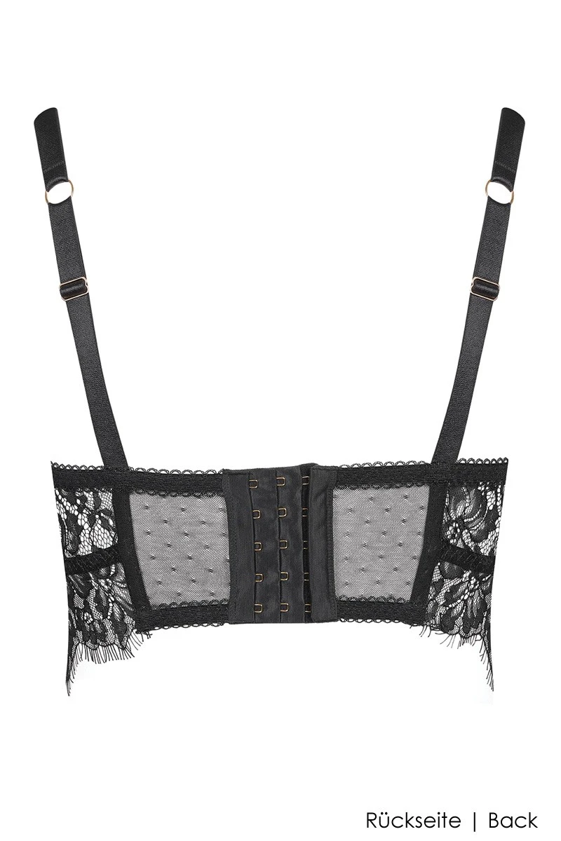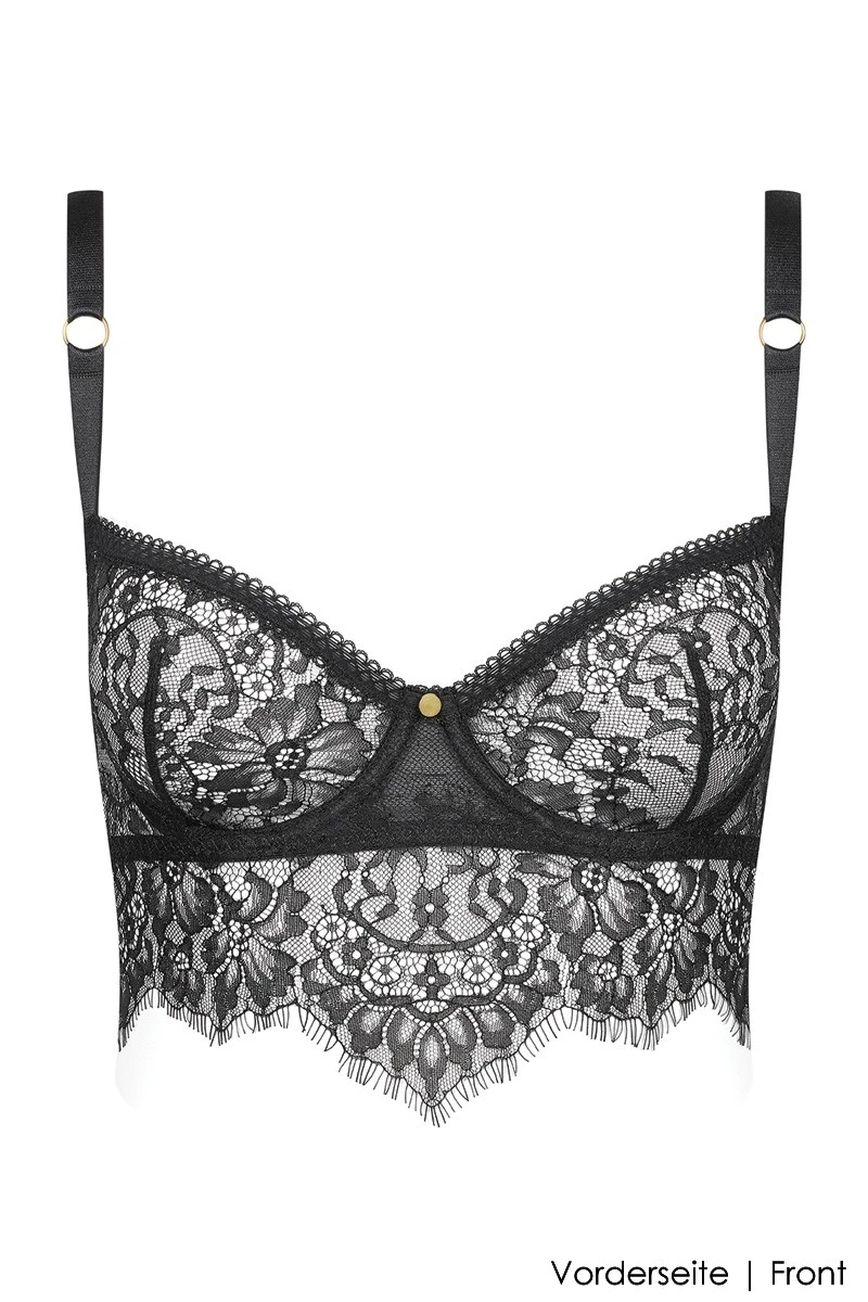 This unique wired bra in bustier design is made of floral „Eyelash“ lace and can be dressed as dazzling erotic lingerie as well as a high fashion piece with your favorite blouse and/or blazer jacket. A decorative trim is crowning the see through lace cups. The same lace had been used along the underbreast band in order to create this stunning look. Here you can perfectly see and appreciate the „Eyelash“ detailing. Combine your new favorite bra with the matching lingerie pieces you can find in our „Complete the look“ slider above and experience finest french lace lingerie at its best!