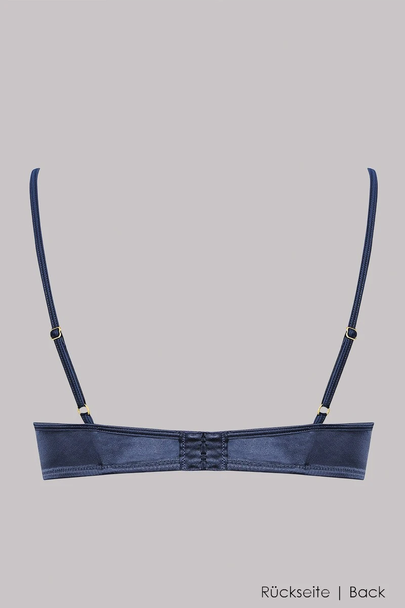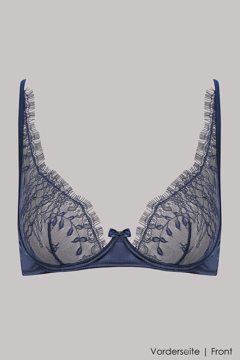 The beautiful floral lace brings the lightness and elegance to this exclusive wired bra in night blue. Also featuring shiny satin, the timeless design ads a great deal of glamour to your fashion outfits. The bra just loves to be revealed from underneath your blouse, dress etc. You can see how easy it will be for you to go through your day from the office, to the after work event all the way to your boudoir. Be assured, you will feel and look amazing in all moments of life.