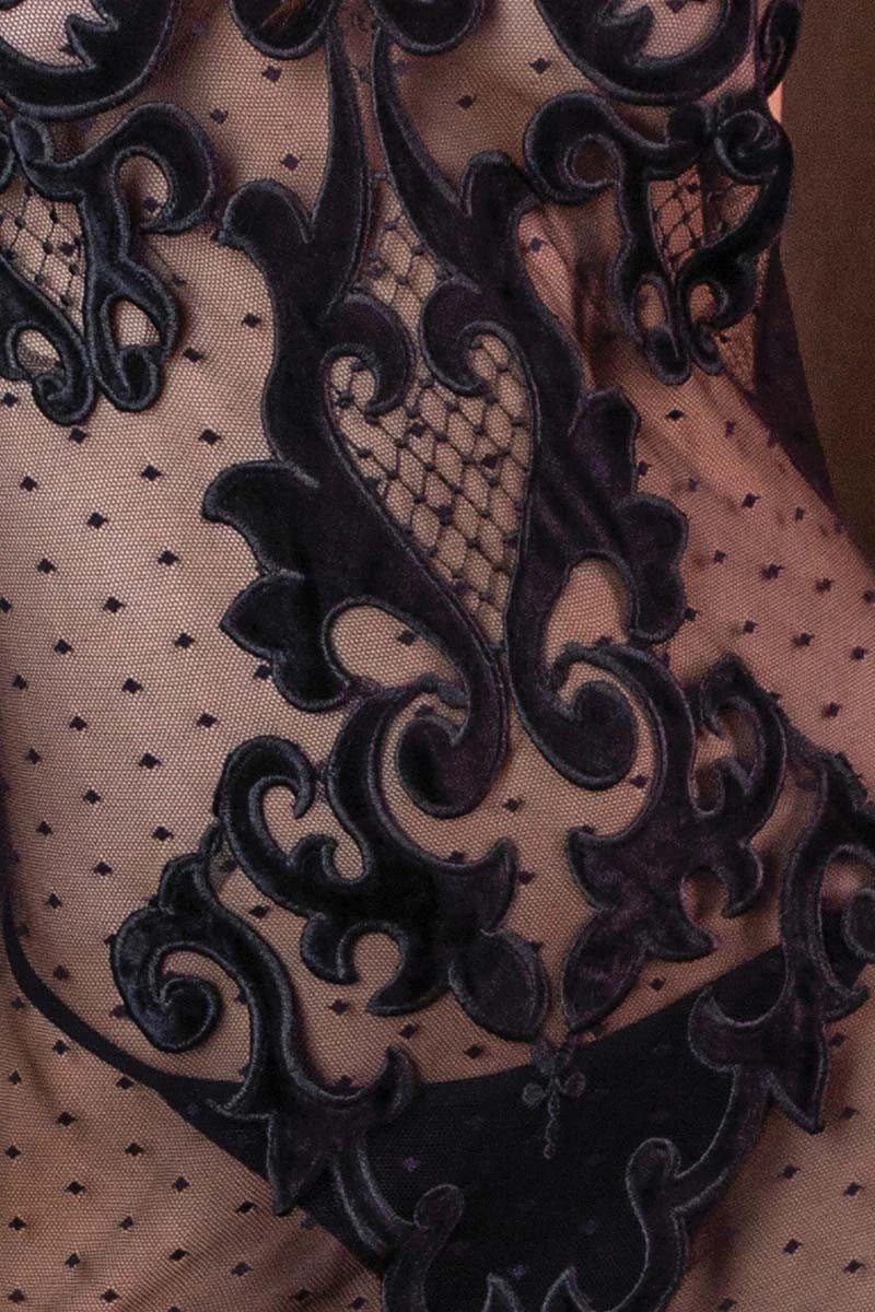 The Marjolaine Noor Luxury Slip Dress is 100% made in France, absolutely stunning and a sensual treat for you and your partner. Slip into this figure hugging dream of dotted see-through mesh with lavish velvet applications and celebrate your femininity. Get inspired by our „Complete the Look“ slider and match your new boudoir favorite with our range of high end lingerie, selected accessories, toys and more!