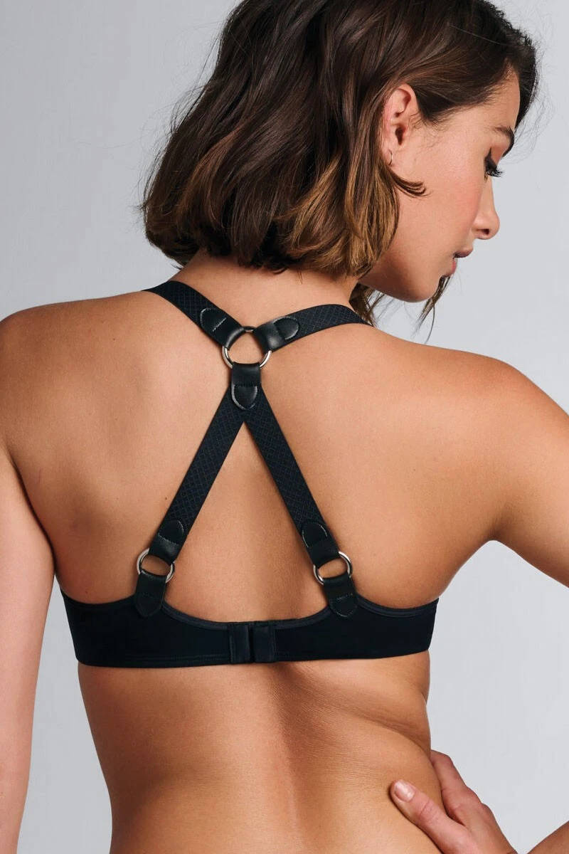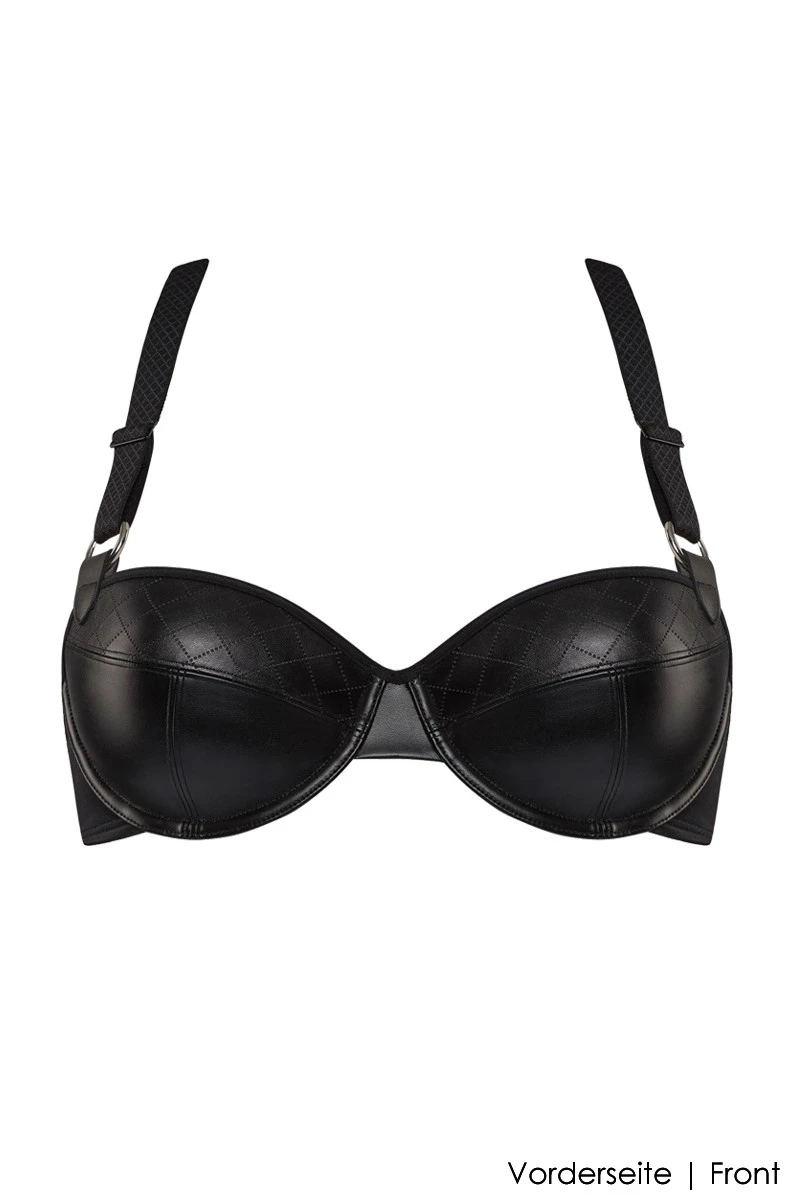Release your inner Femme Fatale with this seductive Balcony Bra by Marlies Dekkers. Designed with a shiny leather look with a subtle diamond pattern and a hot red interior lining, to create a sexy ‚WOW‘ effect. The straps are created in a ‚Suspender‘ like look, also with a diamond pattern and are hold together with silver color rings. Don’t miss the lovely x-shape at the back. A sexy Bra that highlights your décolleté and encourages you to liberate your inner goddess! Don’t forget to combine this piece with the correspondent string, slip and suspender from the same line.