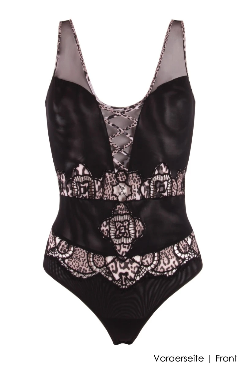 If you are a fan of high fashion bodysuits, you will love this exclusive design of the „Wild“ Collection by RCrescentini! Single and double layer microtulle, shiny satin edgings in an animal print design with decorative „cut-outs“ and embroideries as well as a lacing detail create a unique lingerie look. Dressed as sexy lingerie or as part of a sophisticated fashion look, you will love the unique qualities of this Bodysuit made in Italy.